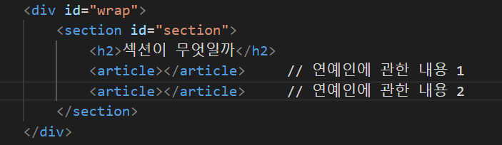 섹션 주제에 주로 제목 요소 <h2> ~ <h6>를 포함하는 것이 좋습니다. 내용이 서로 관련 되어있으면 section을 사용합니다.
