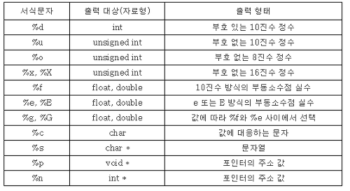 | %.3f | 소수점 이하 3자리 출력(%.f나 %.0f는 소수점 없음) |