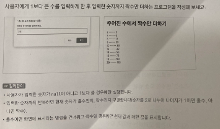 예제 2. 사용자에게 1보다 큰 수를 입력하게 한 후 입력한 숫자까지 짝수만 더하는 프로그램 작성하기