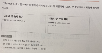// if 조건문을 사용하여 현재 원소가 10보다 큰 경우에만 실행되는 코드 블록을 만듭니다. 만약 현재 원소가 10보다 작거나 같다면, document.write() 함수가 실행되지 않으므로 출력되지 않습니다.